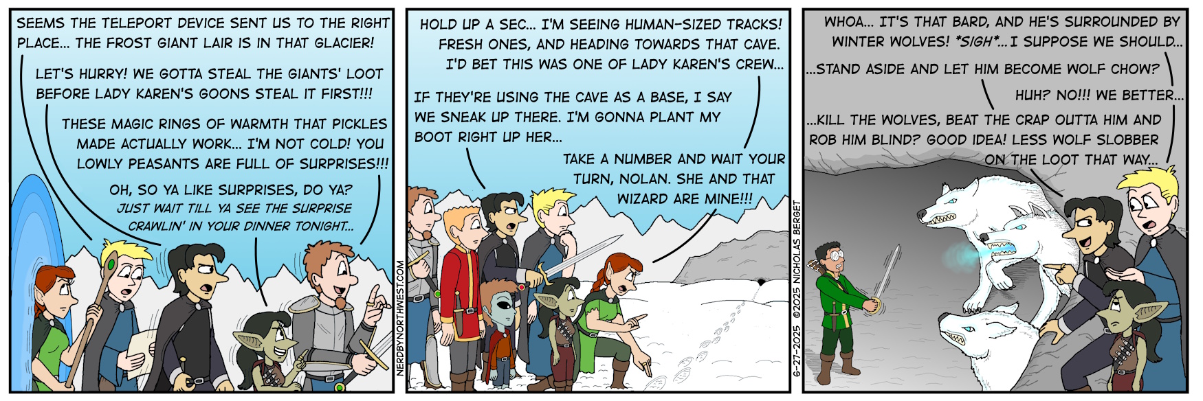 Nerd By Northwest #358 – “Little Red Riding Bard” Jun27 by Nick on June 27, 2025 Chapter: Nerd By Northwest └ Tags: bard, D&D, dungeons and dragons, gaming, lady karen, peasant, winter wolves